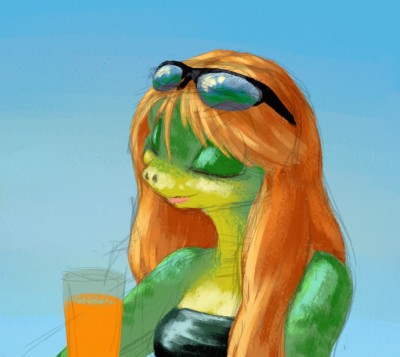 Закончила, наконец, картинку. Лягушка оказалась похожа на ящерицу, рисовалась долго и мучительно, про ошибки и неисправленные корявости и говорить не стану. Бэкгаунд доделывала левой лапой за десять минут.