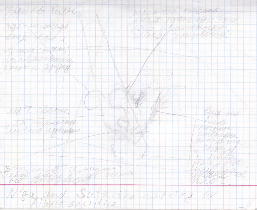 Фрагмент зарисовки очередной идеи. Тоже никуда не годится. Две недели ни практики, ни референса, в перспективе третья. Качество скана такое, что смотреть надо под трёхкратным уменьшением. Депортация из д/о не удалась - забыл дома паспорт.
