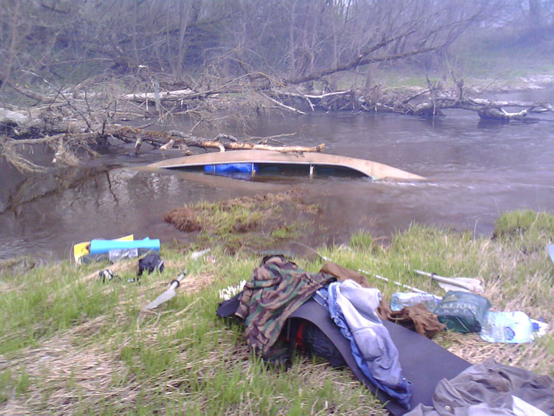 Нам сильно повезло, что глубина там была с метр, а берег близко, основную массу вещей довольно быстро перекидали на берег (читай, в грязь). Мою палатку пришлось догонять – ее вымыло из байдарки, и она даже не утонула. В процессе погони выяснилось, что глубина берега у воды – чуть выше колена, да еще и грязь хорошая, засасывающая. Спасибо, помог Алекс (поначалу тоже узнавший глубину берега), я к тому моменту достаточно замерзла, чтоб напрочь пропало желание прыгать в воду еще раз.