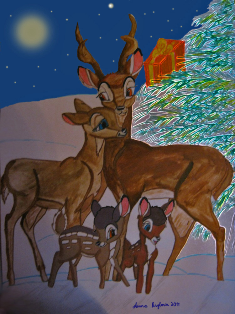 Чуть косячный новогодний арт. Рисовалось гуашью, такие детали, как елка и небо были добавлены в фотошопе. По идее, это арт по "Детям Бемби"