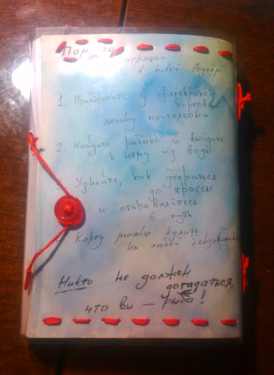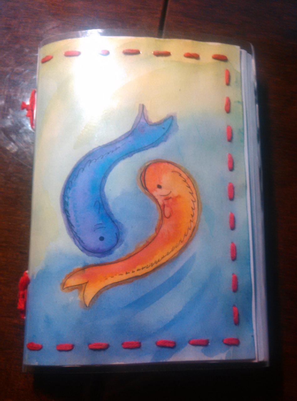 Когда-то - судя по датам в этой теме, аж 7 лет назад - я делал блокнотики, но тут нужно было сделать именно книжечку, и желательно с жёсткой обложкой, иначе быстро испачкается и помнётся, так что технологию пришлось придумывать более-менее с нуля. Обложку я рисовал лайнерами и акварелью по гуашной бумаге (она плотная, но с не настолько выраженной текстурой, как у акварельной), а потом обернул всё целиком в лист прозрачного пластика и пришил его к обложке нитками мулине. Вроде бы получилось довольно прочно, хотя я немного боюсь за пуговицу.